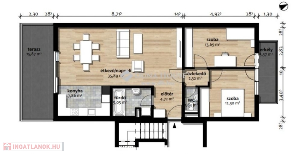 II. kerületben kínálunk megvételre egy 2150 négyzetméteres zöld környezetben elhelyezkedő telken, a legmagasabb műszaki színvonalon épülő, két létesítményből álló épületegyüttesben elhelyezkedő lakásokat. Az ingatlanok jól átgondolt alaprajzzal, jó elrendezéssel, élhető, tágas terekkel tervezték, méretük 83 négyzetmétertől - 147 négyzetméterig terjed, a földszintiekhez kizárólagos kert használat, az emeleti szinthez nagyméretű teraszok tartoznak. Az öt lakás két épületben szinteltolással, egymástól szeparáltan helyezkedik el. Minden épületszint egy-egy lakáshoz tartozik. Nincsenek falszomszédok. A garázsszintet a lakószintekkel lift köti össze. Minden lakás saját Fan Coil fűtéssel és hűtéssel, valamint szellőztető berendezéssel rendelkezik, így biztosítva a pára és allergén mentes levegőt, valamint az egyforma hőmérsékletet évszaktól függetlenül alacsony fenntartási költség mellett. A garázsszinten 10 db gépkocsi beálló és nagyméretű tárolók kerülnek kialakításra. A hirdetésben szereplő ingatlan a 2. emeleten helyezkedik el, déli és nyugati tájolású, 83 négyzetméter területű + 15,87 és 5,37 négyzetméteres terasz tartozik hozzá. Nappali-amerikai konyha, 2 hálószoba, fürdő és 2 erkély került kialakításra.