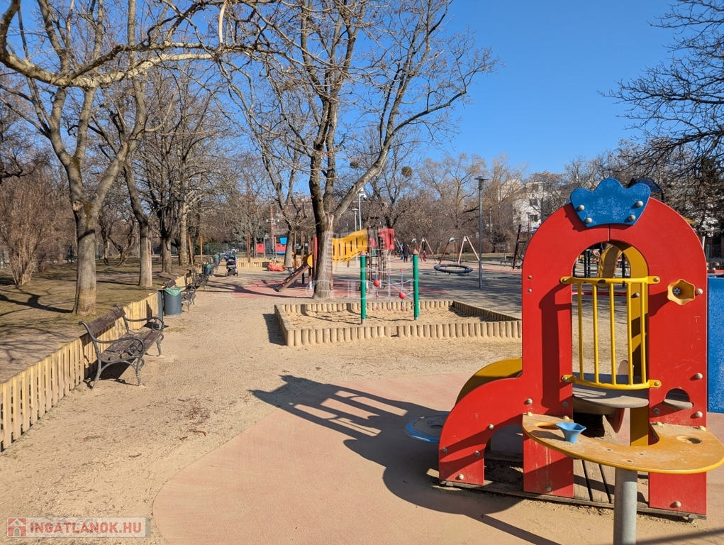 Közvetlen közelben park nagy játszótérrel és futókörrel.