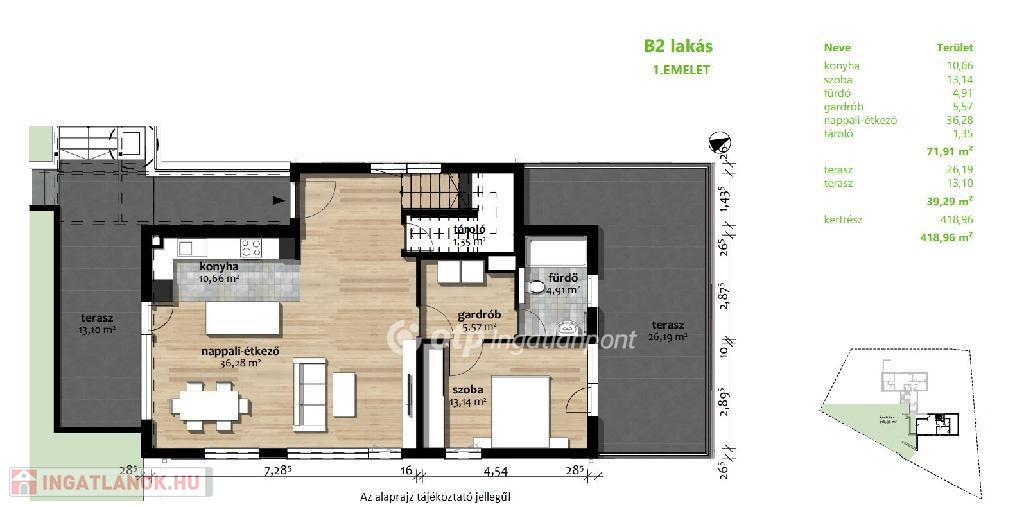 A megvételre kínált ingatlan szinte önálló családi házként került kialakításra. Ugyan az első emelettől indul az ingatlan alsó része, de kétszintes kialakításának + a padlásnak köszönhetően, továbbá, hogy csak egy alsó, szeparált szomszédja van így az önálló családi ház érzést nyújtja. 210 nm-es lakóterületen összesen 5 szobát alakítottak ki, a kedvező térszerkezetnek köszönhetően mindegyik külön nyílik és jól szeparált egymástól. A tervezők arra is figyeltek, hogy két master bedroom (privát gardróbbal és fürdővel) is kialakításra került, egy a földszinten, egy pedig az emeleten. A padlástér további 63,5 nm, melynek hasznosítása az új tulajdonos fantáziájára van bízva. A nappali és az alsó szinten lévő háló közvetlen, összesen 40 nm-es terasz és 384 nm-es privát kert kapcsolattal rendelkezik. Elosztását tekintve nappali + 4 hálószobával rendelkezik, jól elkülönülten, hogy a család minden tagjának meglegyen az intim szférája. Két fürdőszoba került kialakításra, így dupla komfortosnak tekinthetjük, a privát kertkapcsolat a teraszról érhető el. Hatalmas és egyben jól tájolt nyílászáróinak köszönhetően a nap minden szakaszában világos, tájolása Dél-nyugati.