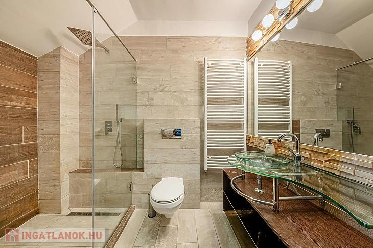 Az alsó szinten található egy különálló mosdó, még a felső emeleten egy beépített zuhanyzós ideális méretű fürdőszoba.