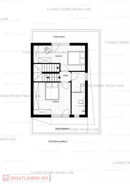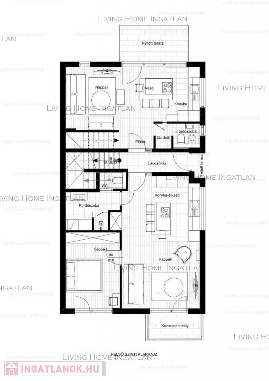 AZ EMELETEN -A lépcsőről felérve, fényárban úszó térbe érkezünk. Itt kapott helyet 2 szoba és egy újabb fürdőszoba.