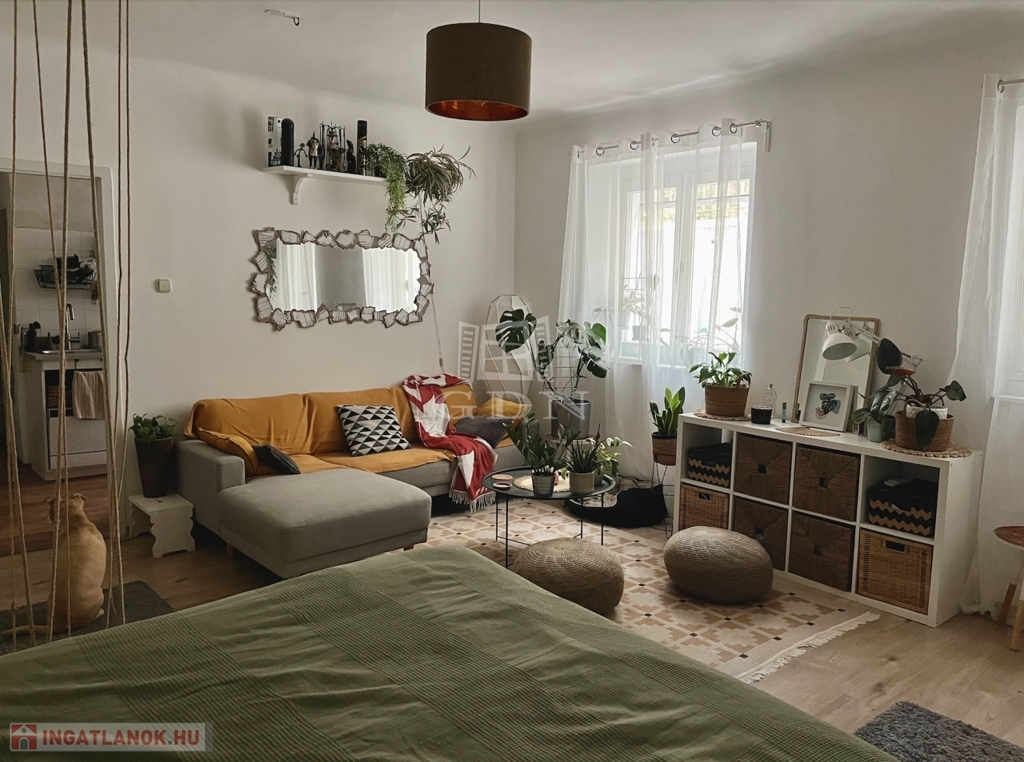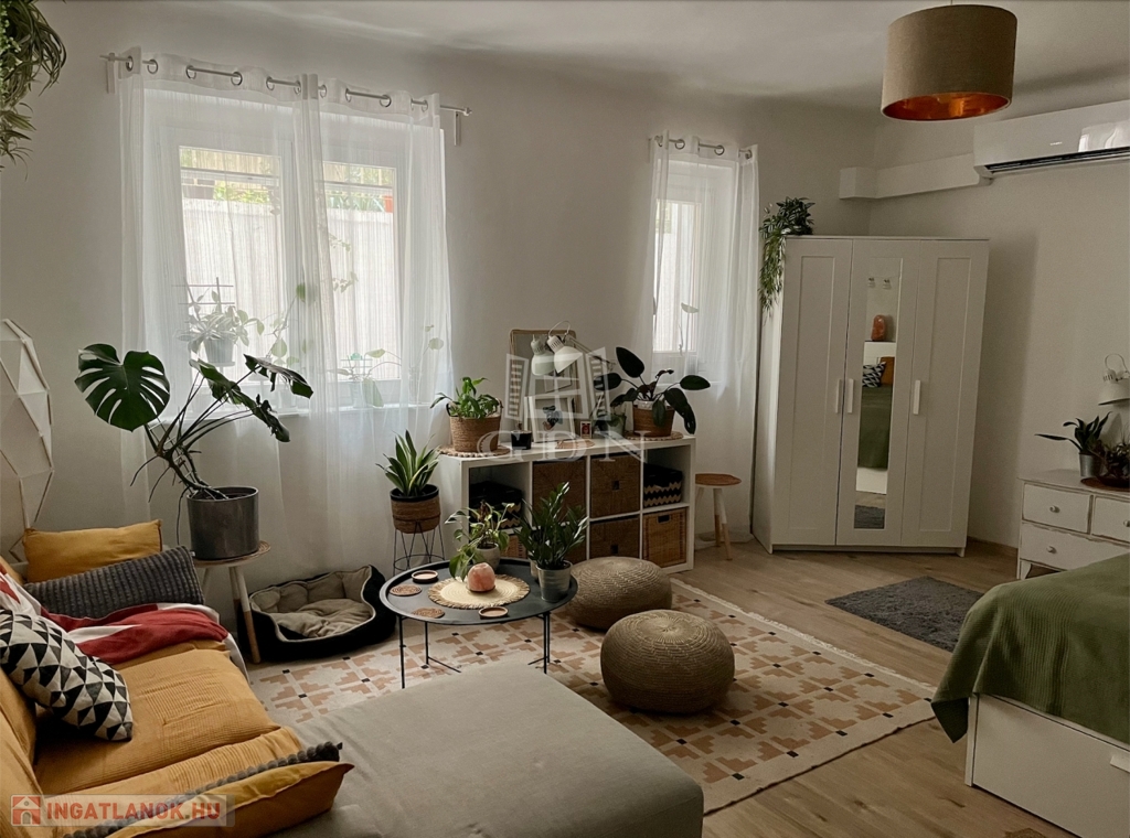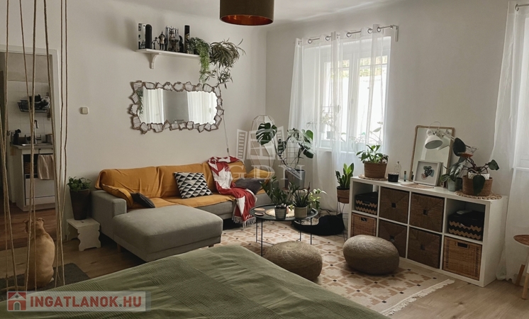 A lakás egy tágas szobából áll, melynek ablakai a kellemes kertre néznek, így garantálva a nyugodt, természetközeli életérzést.