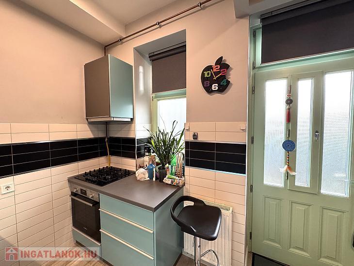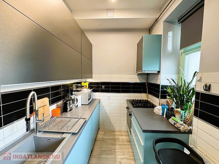 A világos, ablakos konyhába új konyhabútorok kerültek beépítésre, valamint beépített villanytűzhellyel és mosogatógéppel rendelkezik.