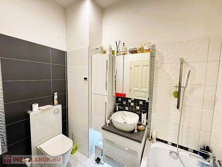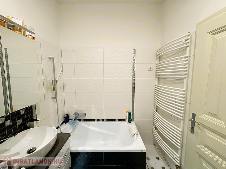 A fürdőszoba új burkolatot kapott és új akrilkáddal rendelkezik. A mosógép ebben a helyiségben kapott ki- és beállást.