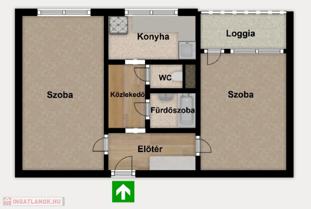 Az ingatlan elosztása rendkívül praktikus: két külön nyíló szoba biztosít kényelmes életteret akár pároknak, kisebb családnak vagy befektetési célra is ideális választás lehet. A nappaliból nyíló loggia kellemes kikapcsolódási lehetőséget nyújt, ahonnan zöld parkra nyíló kilátás fogad – tökéletes helyszín egy reggeli kávéhoz vagy esti pihenéshez.