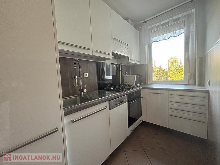 A konyha a lakás egyik ékköve: felújított, modern hangulatú, igényesen kialakított, és bőséges munkafelületet kínál a mindennapi főzéshez.
