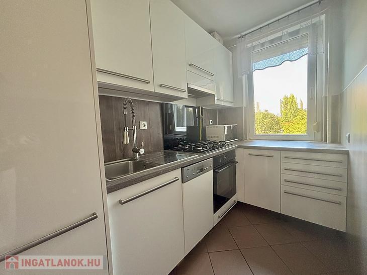 A konyha a lakás egyik ékköve: felújított, modern hangulatú, igényesen kialakított, és bőséges munkafelületet kínál a mindennapi főzéshez.
