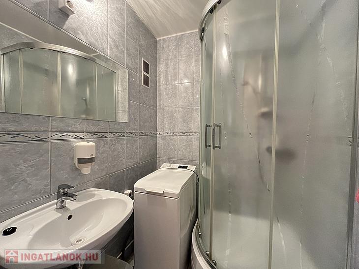 A fürdőszoba új burkolatot kapott, zuhanykabinos. A mosógép be-és kiállása is ebben a helyiségben lett kialakítva.