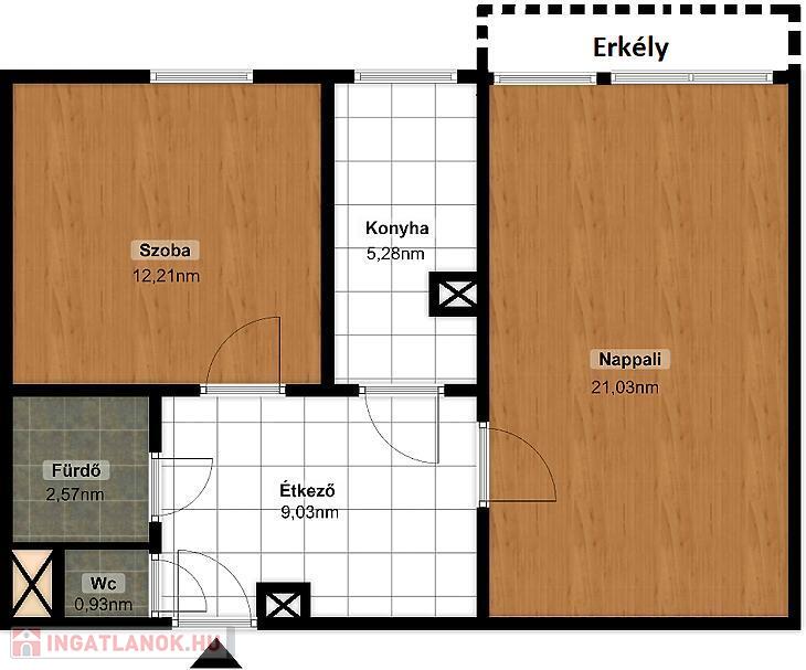 A szobákban laminált parketta, a többi helyiségben járólap található.