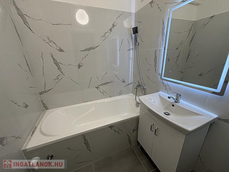 A fürdőszoba új burkolatokat és kádat kapott, a mosógép kiállása itt található.