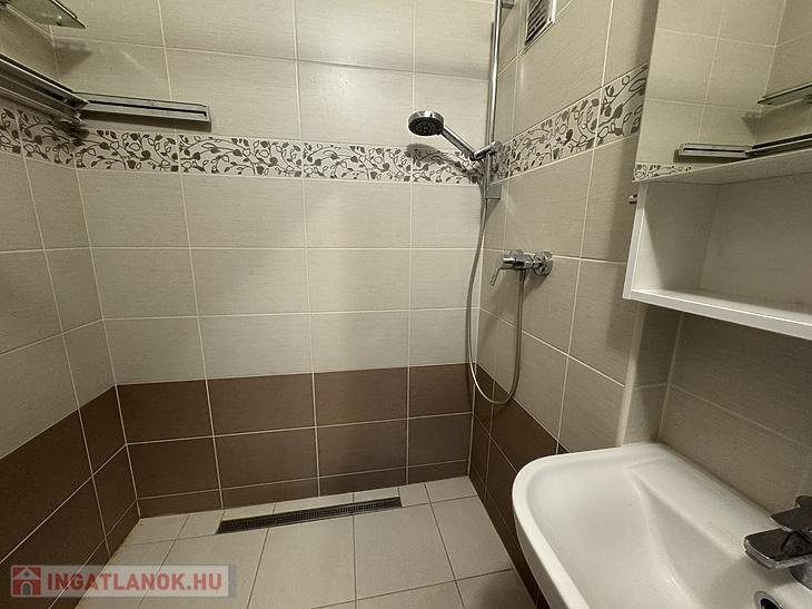 A fürdőszobában épített zuhanyzó található, amely modern, letisztult megjelenést kölcsönöz a térnek.