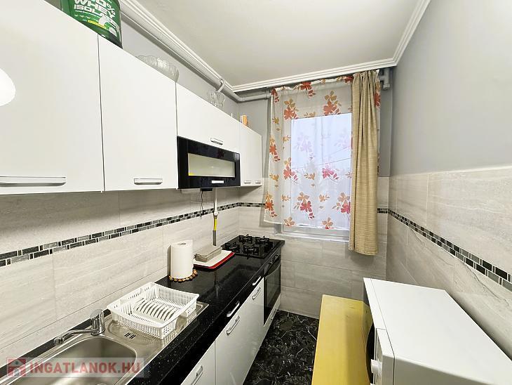 A világos, ablakos konyhába új konyhabútorok kerültek beépítésre, valamint beépített gáztűzhellyel és villanysütővel rendelkezik.