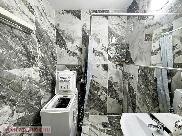 A fürdőszoba új burkolatot kapott és zuhanyzóval rendelkezik. A mosógép ebben a helyiségben kapott ki- és beállást, a WC egy külön helyiségben található.