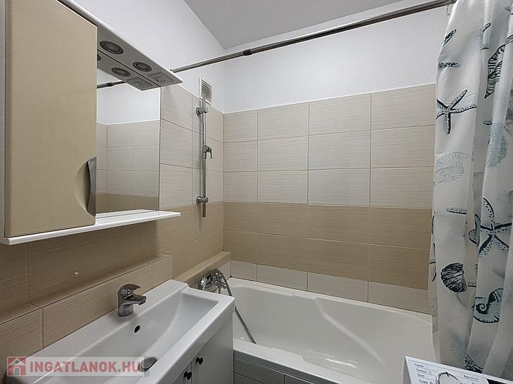 A fürdőszoba szintén teljesen megújult: új akrilkád és új burkolatok kerültek be, letisztult, időtálló stílusban.