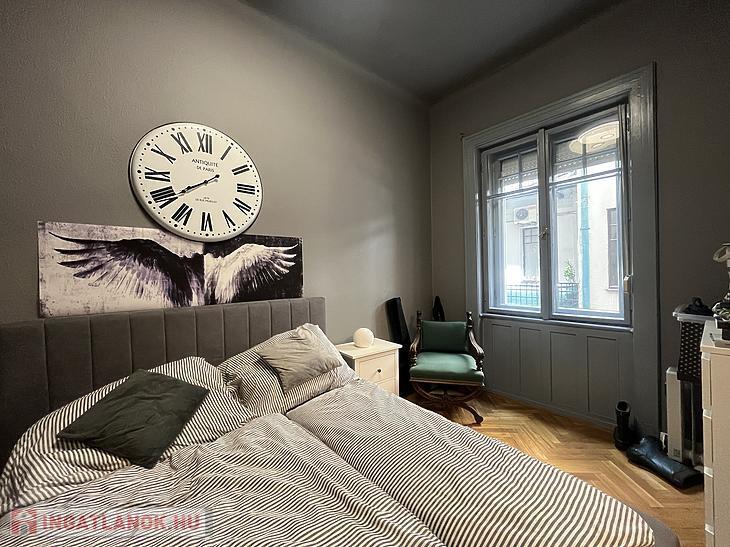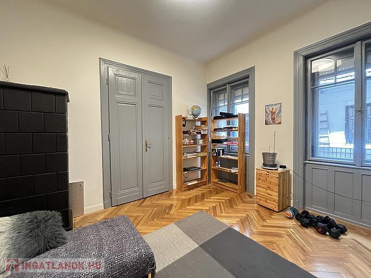 A szoba faparkettás, a vizeshelyiségek pedig járólaposak.