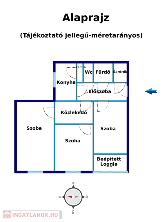 3 szoba (külön nyílnak) (17m2+11,6m2+12,7m2), Beépített lodzsa, Közlekedő, Előszoba, Konyha, Kamra, Fürdő, WC, Gardrób
