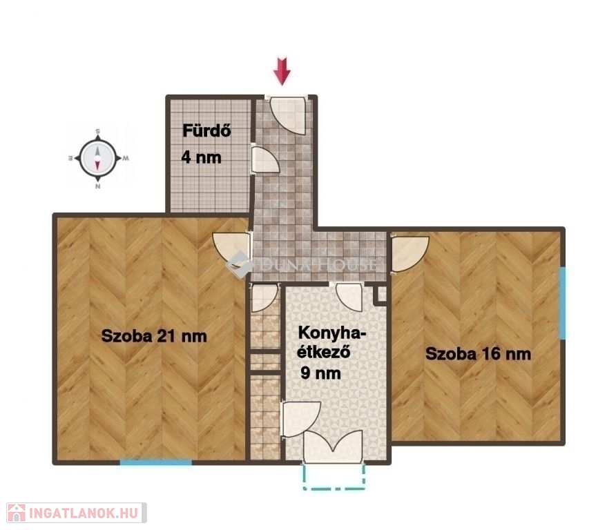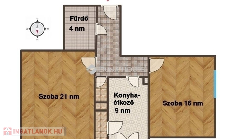 Helyiséget: 2 db szoba (21 nm és 17 nm), tágas konyha-étkező (9,2 nm) kamrával, fürdőszoba (4 nm), valamint különálló mellékhelyiség. A konyhából 2 nm-ees erkély nyíilk.