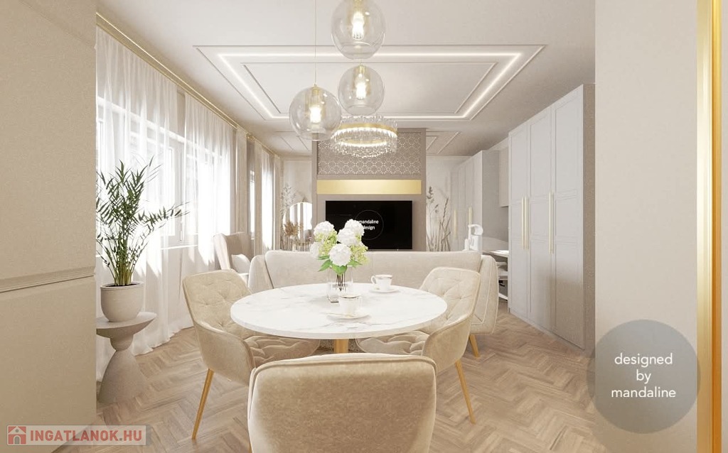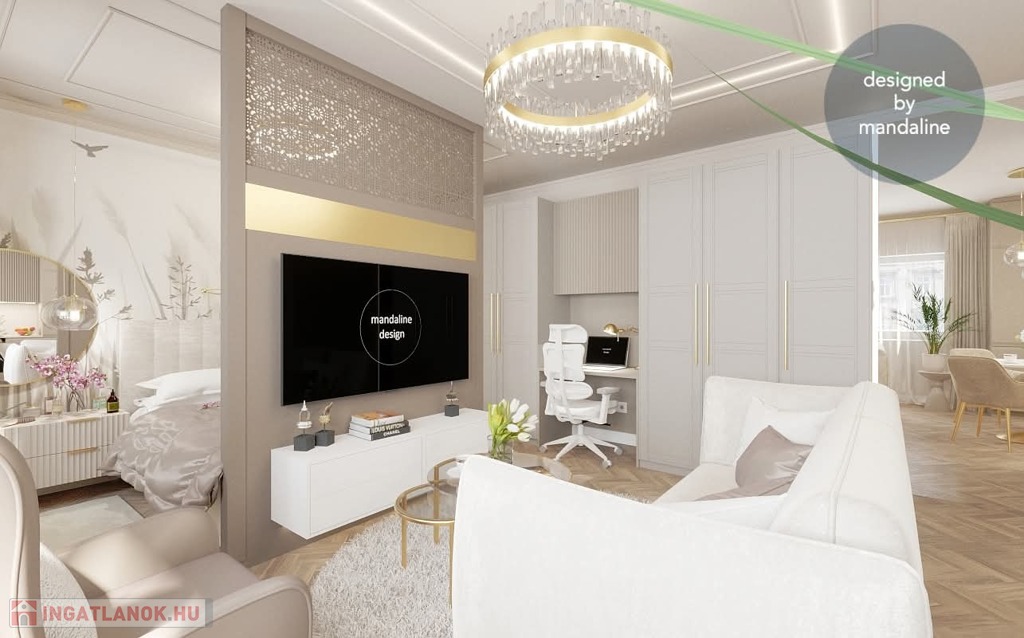 A lakás hangulata az első pillanattól magával ragad: a letisztult színek, az egységes burkolatok, az ízlésesen kiválasztott csillárok és világítótestek, a finoman megválasztott függönyök, a beépített és szabadon álló bútorok együttese valódi otthonérzetet teremt.