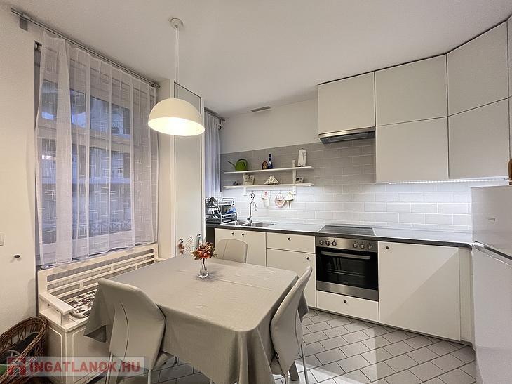 A konyha új bútorzatot kapott, étkezővel rendelkezik. A mosógép ki-és beállása ebben a helyiségben került kialakításra.