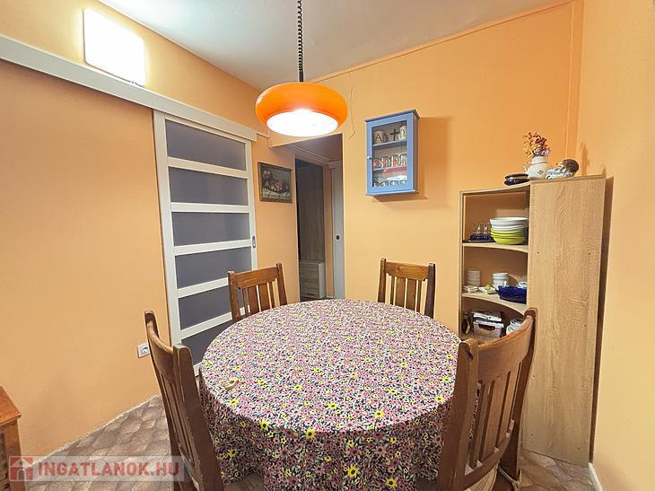 A falak simára festettek, a bal oldali hátsó szoba tapétás, ami külön hangulatot ad neki. Az étkező tágas, ideális helyet kínál a közös étkezéseknek és a családi beszélgetéseknek.