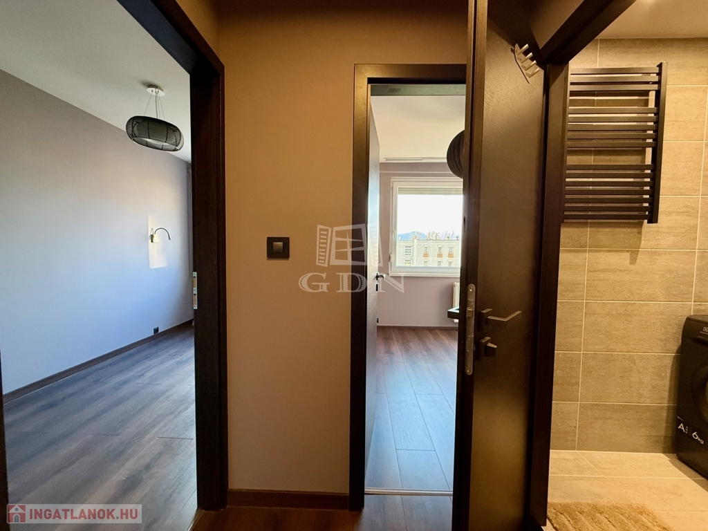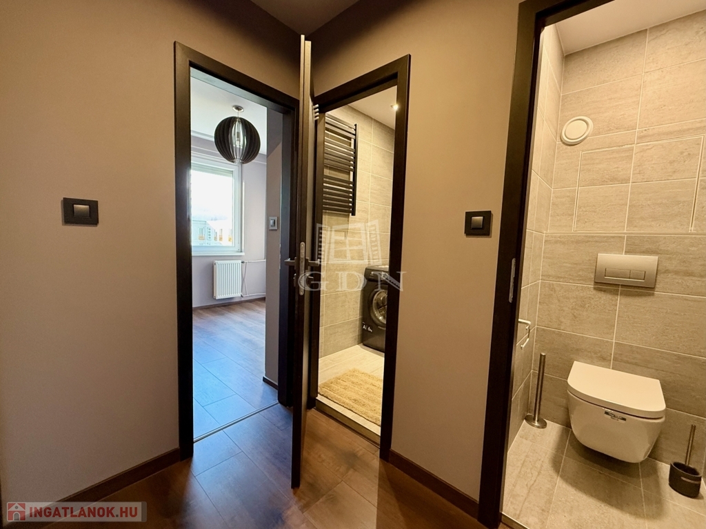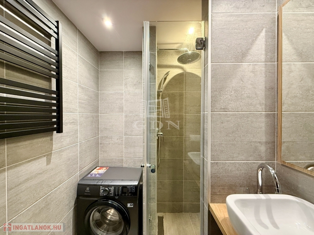 A hálószoba csendes, jól berendezhető, a fürdőszoba pedig modern, visszafogott stílusú, épített zuhannyal és minőségi burkolatokkal. A mosógép diszkréten, beépítve kapott helyet, a külön WC pedig érezhetően növeli a komfortot.