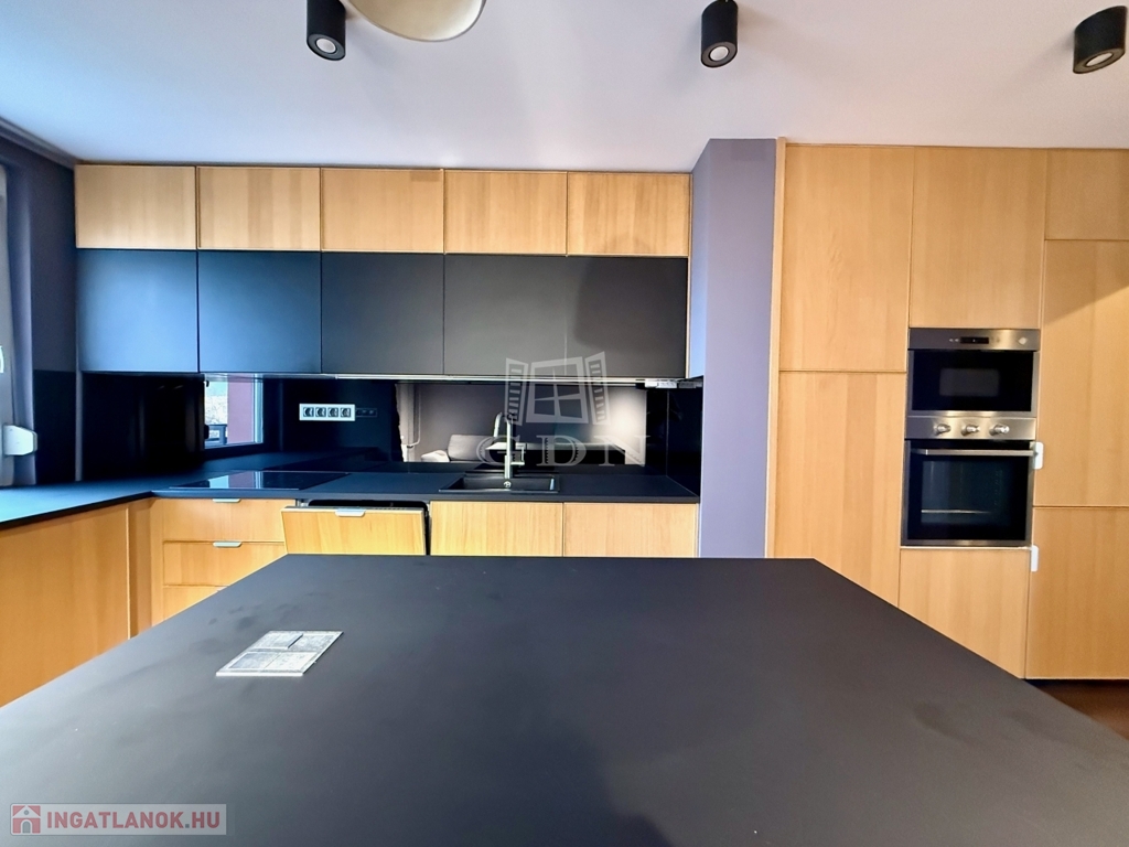 A nappali és a konyha egy légtérben kapott helyet, mégsem zsúfolt. A teljes falon futó konyhabútor, a nagy munkafelület és a szigetes kialakítás jól használható, mindennapi életteret ad. Innen közvetlenül elérhető az erkély, ami kényelmesen használható – akár egy gyors reggelihez, akár egy esti leüléshez.