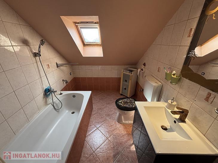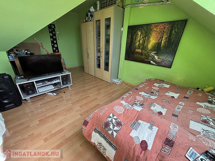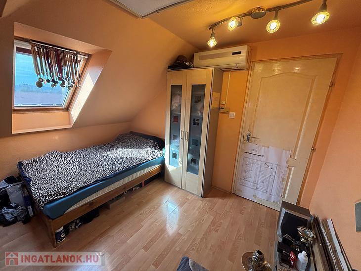 A tetőteret 2005.-ben beépítették, Br.: 41nm, N.: 23nm, 2szoba, fürdőszoba + WC, előszoba helyiségekből áll. Az ablakok VELUX fa típusúak, gyártott, külső rolós és belső árnyékolóval. A szobák laminált parkettások, a többi helyiség járólapos.