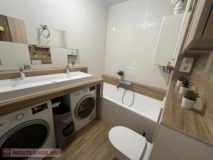 A lakásban korszerű víz, gáz és villanyhálózat került kialakításra. Több ponton záródó, biztonsági bejárati ajtó, modern beltéri ajtók, valamint műanyag keretes, thermo üveges nyílászárók és fa keretes velux ablakok kerültek beépítésre. A szobákban laminált padlót és fa parkettát helyeztek le, a többi helyiséget járólappal burkolták. Minden helyiségben lapradiátor található. A fűtést és a melegvíz ellátást kombi cirkókazán biztosítja, az elszámolás fogyasztás alapján is történhet, jelenleg havi 13.000.- f tat átalánydíj. A nagyobb komfortérzet kialakításának érdekében a nappaliba felszerelésre került légkondicionáló berendezés is.