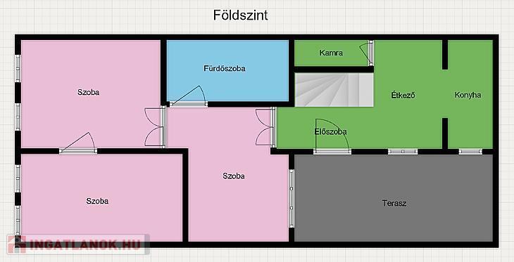 A földszinten 3 szoba, fürdőszoba, konyha, tágas étkező és kamra található.
