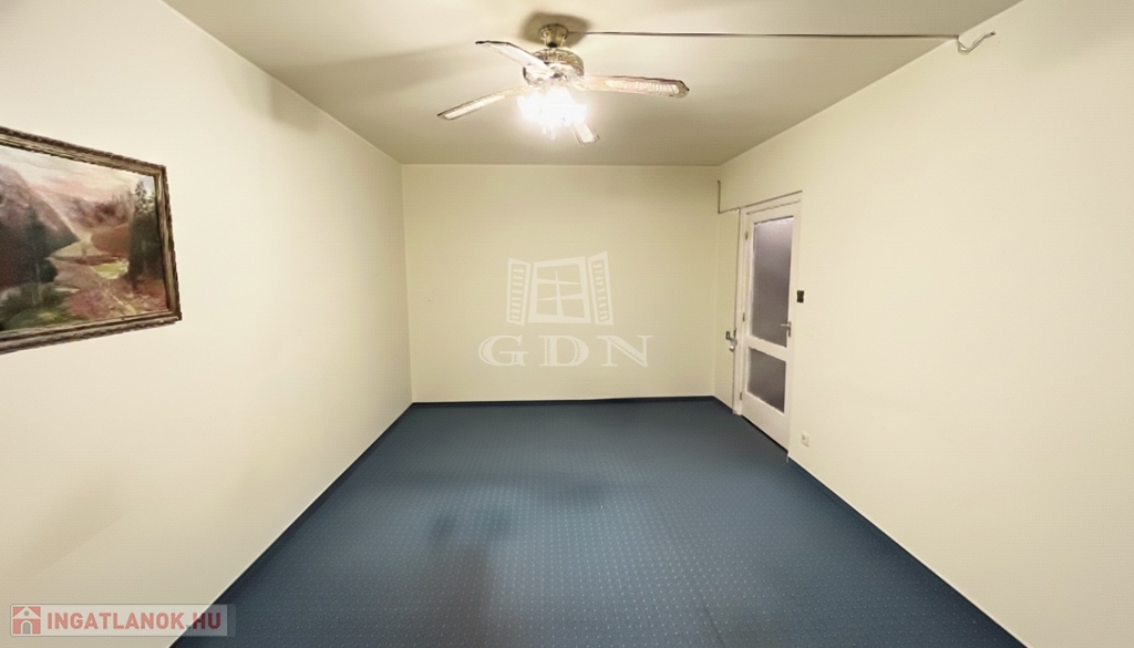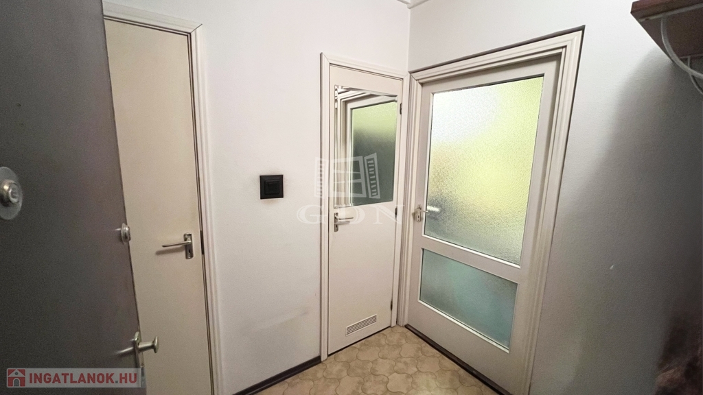 Az előszobából külön nyílik a fürdőszoba és a WC, itt kapott helyet egy beépített gardróbszekrény is. A tágas, padlószőnyeggel burkolt szobából nyílik a konyha, amely ablakos, konyhabútorral felszerelt.