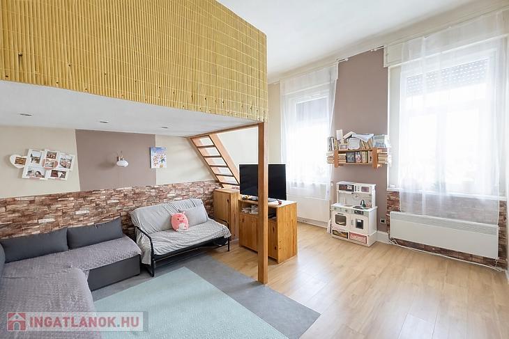 A lakás belmagasságának köszönhetően már kialakításra került galéria, illetve a tetőtér beépítése is elkezdődött (szigetelés + gipszkarton).