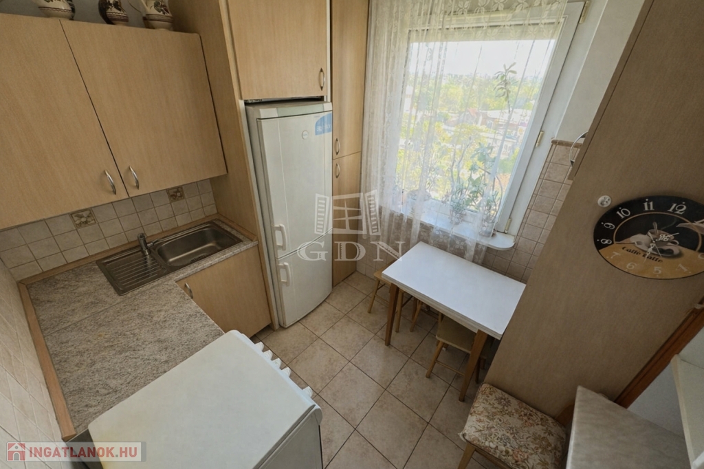 A lakás nyugati fekvésű, napos és világos, a konyha ablakos, így a természetes fény egész nap jelen van.
