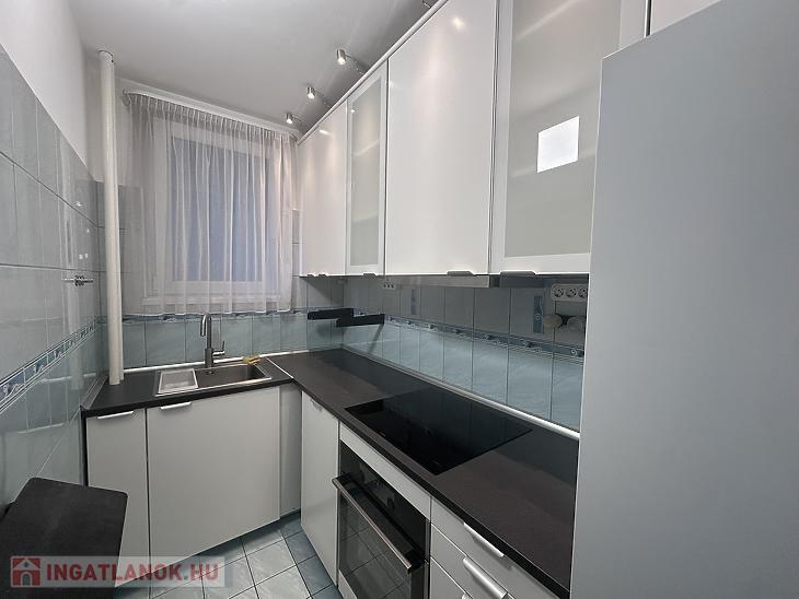 Konyhája ablakos, világos. A beépített bútorzat és a gépesítés a vételár részét képezi.