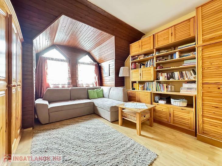 A tetőtéri kialakításnak köszönhetően hangulatos, világos terek jellemzik. A konyha és a szobák is természetes fényt kapnak, barátságos, otthonos érzetet biztosítva.