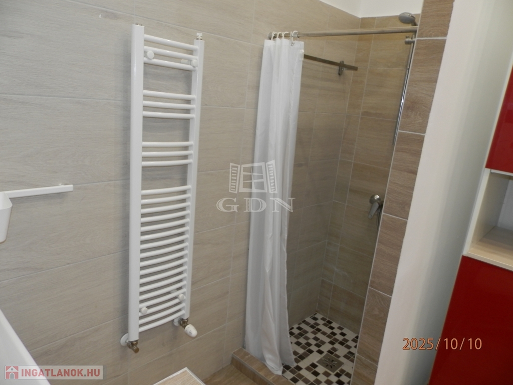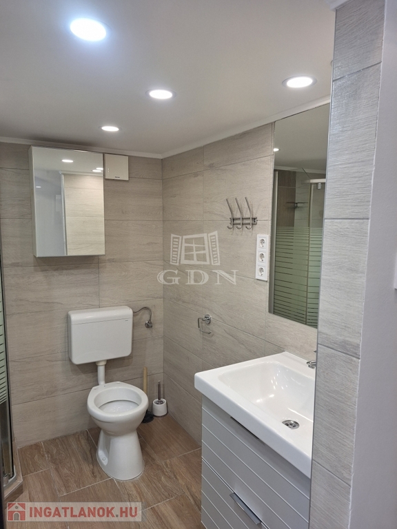 A 58 m²-es lakás tágas, világos, két fürdőszobás, akár két külön bérlő számára is ideális.