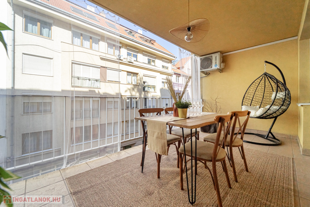 A liftes lakás a 2. emeleten helyezkedik el, utcára néző, keleti fekvésű, de mégis elég világos, légkondicionált. Az elmúlt hónapokban teljes körű felújításon esett át: új burkolatok, festés, designbútorok, valamint prémium gépesített konyha került kialakításra. A nappaliból nyílik a hatalmas, 14,5 m²-es loggia, amely kiválóan használható étkezésre, pihenésre, és akár be is építhető!