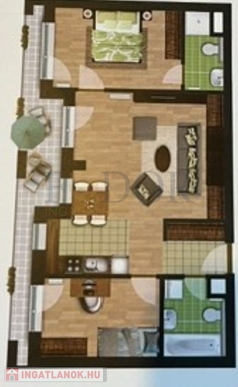 • 66 m²-es lakótér, 3 külön nyíló szoba