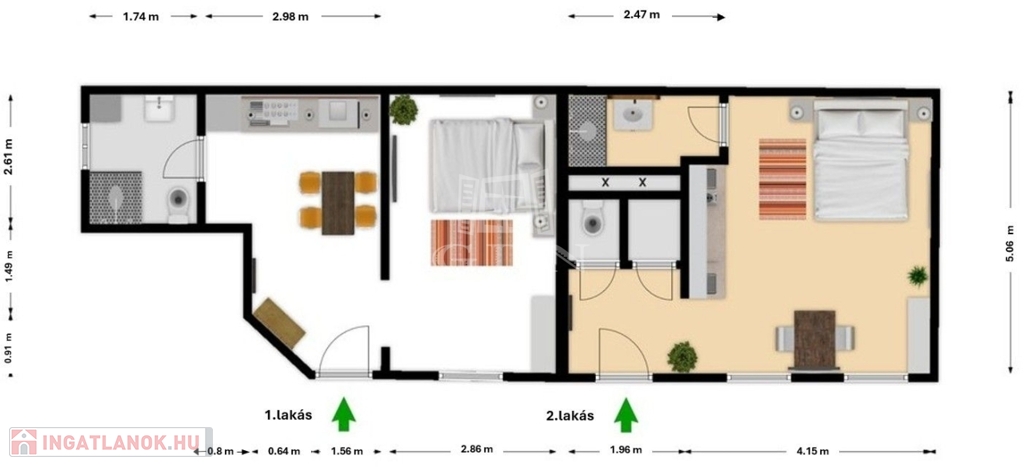 28 nm alapterület: közlekedő, WC, kamra, amerikai konxhás nappali szoba, fürdőszoba