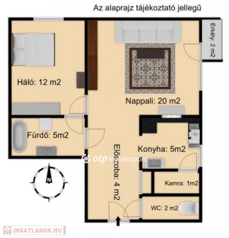 A lakás 49 m2 alapterületű, 2 szobás, ERKÉLYES, átlagos állapotú.