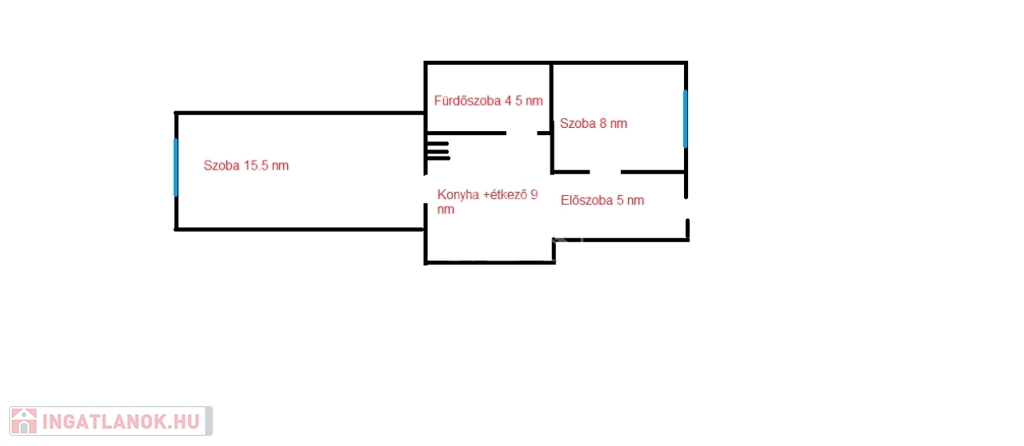 A konyha-étkezőből nyílik a 15.5 nm-es nagyobb szoba, kilátása utcai.