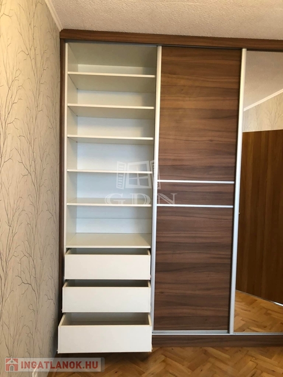 Az előszobában teljes hosszban beépített szekrény, a hálószobában három tolóajtós gardrób kapott helyet.
