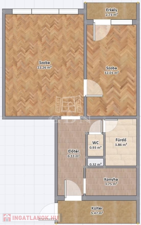 A nappali klímás, műanyag redőnyökkel felszerelt, mindkét szoba parkettázott.