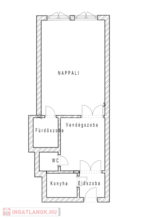 előszoba, hall, melyből egy szoba nyílik, étkező, konyha, fürdőszoba, vendég-WC.