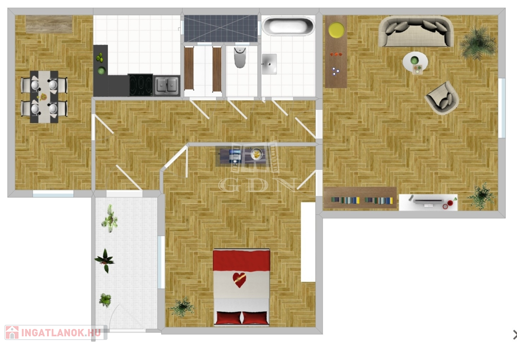 Az átalakítás során a konyha és 3. szoba egyesítésre került, jelenleg konyha, étkező és dolgozó sarokként funkcionál. A konyha nappaliba való áthelyezésével egy nagyobb szoba is létrehozható.