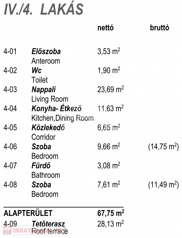A 87m2-es értékesítési alapterület tartalmazza a nettó 68m2-es lakótéren felül 190cm alatti területek (9m2) és a terasz (28m2) területének 50%-át.