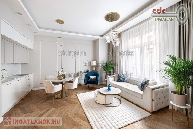 fő hálószobához egy elegáns káddal, WC-vel és bidével felszerelt fürdőszoba kapcsolódik, míg a második szobához egy modern zuhanyzós fürdő. Az ingatlan prémium minőségű bútorokkal és gépekkel együtt eladó, így az új tulajdonos azonnal beköltözhet egy teljesen felszerelt, exkluzív otthonba. A teljes körű felújítás során megtörtént a víz- és villanyvezetékek, valamint a fűtéscsövek, radiátorok cseréje. Designer csillárok, beépített szekrények, minőségi szaniterek és prémium burkolatok kerültek beszerelésre. A 3,30 méteres belmagasság és a chevron mintás tölgyfa parketta különleges, elegáns hangulatot kölcsönöz az otthonnak. A konyha teljesen gépesített, AEG márkájú készülékekkel felszerelt, mosogatógép, hűtő fagyasztóval, sütő, mikró, főzőlap, páraelszívó és mosógép is rendelkezésre áll. A lakás kényelmét két légkondicionáló és automata redőnyök, plusz sötétítők biztosítják. A fűtést házközponti rendszer biztosítja, a közös költség vízzel együtt 53.709.- Ft havonta. A társasház a klasszikus budapesti építészeti stílust képviseli. Az épület az 1900-as évek elején épült, és azóta számos felújításon esett át, megőrizve eredeti báját és eleganciáját. Az ingatlan, a lifttel felszerelt társasház 2. emeletén található a lépcsőházból nyílik a bejárati ajtó. A közvetlen közelben több busz- és villamosvonal elérhető, amelyek gyors és kényelmes kapcsolatot biztosítanak a város többi részével. Ez a lakás nem csak otthonként, hanem befektetésként is tökéletes választás azok számára, akik a belvárosi luxust és kényelmet keresik. Az ingatlan minden részlete a legmagasabb színvonalat
