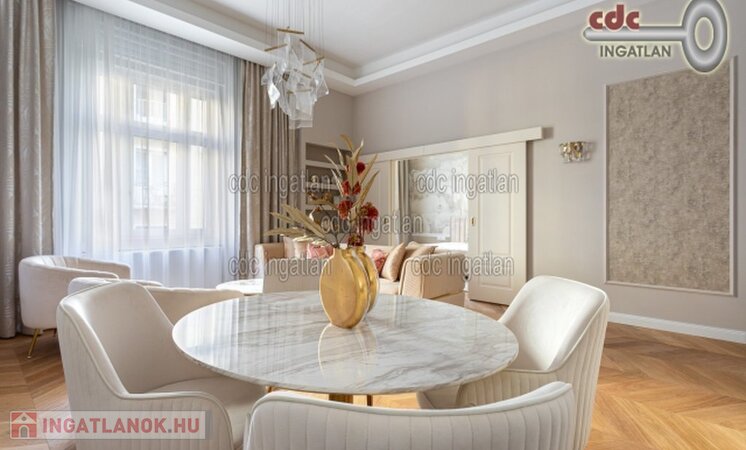 Belvárosi elegáns, exkluzív luxuslakás eladó! V. kerületben, a Nyáry Pál utcában, a Váci utca szomszédságában, III. emeleti, 89 m2-es nappali + 2 hálószobás, duplakomfortos, vendég wc-s, luxuslakás eladó. Az ingatlan prémium minőségű felújításon esett át, melynek során a legkiválóbb minőségű anyagokat használták fel, a lakás minden részletében az eleganciát tükrözi. Az ingatlan amerikai konyhás nappalival rendelkezik, a fő hálószoba és a nappali a csendes Nyáry Pál utcára néz, míg a második hálószoba a nyugodt belső udvarra nyílik. Mindkét hálószobához külön fürdőszoba tartozik, a fő hálószobához egy elegáns káddal, WC-vel és bidével felszerelt fürdő kapcsolódik, míg a második hálószobához egy modern zuhanyzós. A lakásban külön vendég WC is található. Az ingatlan prémium minőségű bútorokkal és gépekkel együtt eladó, így az új tulajdonos azonnal beköltözhet egy teljesen felszerelt, exkluzív otthonba. A teljes körű felújítás során új nyílászárók lettek beépítve, valamint minden víz- és villanyvezetékek cserélve lett. Designer csillárok, beépített szekrények, minőségi szaniterek és prémium burkolatok kerültek beépítésre. A 3,6 méteres belmagasság és a chevron tölgyfa parketta különleges, elegáns hangulatot kölcsönöz az otthonnak. A konyha teljesen gépesített, AEG márkájú készülékekkel felszerelt: mosogatógép, hűtő fagyasztóval, sütő, főzőlap, páraelszívó és mosó- szárítógép is rendelkezésre áll. Az ingatlan kényelmét három légkondicionáló és automata redőnyök biztosítják. A fűtés és a melegvíz kondenzációs kazánról üzemel, a közös költség vízdíjat és célbefizetést tartalmaz, melynek összege 42.809.-Ft havonta. Ez a lakás nem csak otthonként, hanem befektetésként is tökéletes választás azok számára, akik a belvárosi luxust és kényelmet keresik. Az ingatlan minden részlete a legmagasabb színvonalat képviseli, így garantáltan megfelel a legigényesebb vásárlók elvárásainak is.