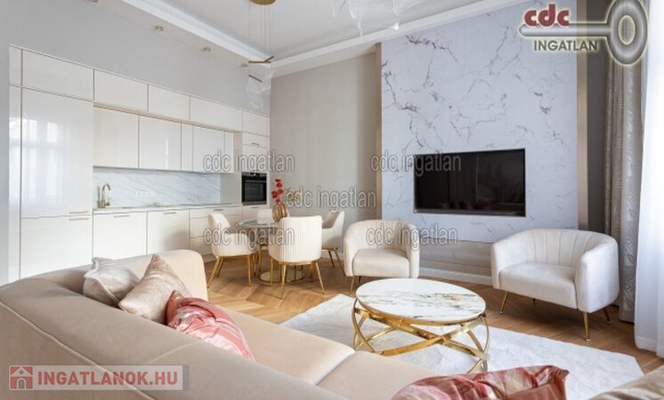 Belvárosi elegáns, exkluzív luxuslakás eladó! V. kerületben, a Nyáry Pál utcában, a Váci utca szomszédságában, III. emeleti, 89 m2-es nappali + 2 hálószobás, duplakomfortos, vendég wc-s, luxuslakás eladó. Az ingatlan prémium minőségű felújításon esett át, melynek során a legkiválóbb minőségű anyagokat használták fel, a lakás minden részletében az eleganciát tükrözi. Az ingatlan amerikai konyhás nappalival rendelkezik, a fő hálószoba és a nappali a csendes Nyáry Pál utcára néz, míg a második hálószoba a nyugodt belső udvarra nyílik. Mindkét hálószobához külön fürdőszoba tartozik, a fő hálószobához egy elegáns káddal, WC-vel és bidével felszerelt fürdő kapcsolódik, míg a második hálószobához egy modern zuhanyzós. A lakásban külön vendég WC is található. Az ingatlan prémium minőségű bútorokkal és gépekkel együtt eladó, így az új tulajdonos azonnal beköltözhet egy teljesen felszerelt, exkluzív otthonba. A teljes körű felújítás során új nyílászárók lettek beépítve, valamint minden víz- és villanyvezetékek cserélve lett. Designer csillárok, beépített szekrények, minőségi szaniterek és prémium burkolatok kerültek beépítésre. A 3,6 méteres belmagasság és a chevron tölgyfa parketta különleges, elegáns hangulatot kölcsönöz az otthonnak. A konyha teljesen gépesített, AEG márkájú készülékekkel felszerelt: mosogatógép, hűtő fagyasztóval, sütő, főzőlap, páraelszívó és mosó- szárítógép is rendelkezésre áll. Az ingatlan kényelmét három légkondicionáló és automata redőnyök biztosítják. A fűtés és a melegvíz kondenzációs kazánról üzemel, a közös költség vízdíjat és célbefizetést tartalmaz, melynek összege 42.809.-Ft havonta. Ez a lakás nem csak otthonként, hanem befektetésként is tökéletes választás azok számára, akik a belvárosi luxust és kényelmet keresik. Az ingatlan minden részlete a legmagasabb színvonalat képviseli, így garantáltan megfelel a legigényesebb vásárlók elvárásainak is.