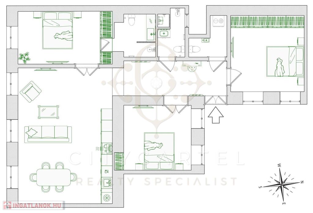 A lakás központi tere egy elegáns, tágas 37 nm-es nappali, amely magában foglalja a konyhát, étkezőt és a lounge részt. A 15 nm-es master bedroom (en suite) fürdővel és gardróbbal biztosít privát kényelmet, emellett két további – egyenként 15 és 13 nm-es – hálószoba is rendelkezésre áll, melyek ideálisak gyerekszobának vagy dolgozónak. A lakás funkcionalitását tovább növeli a második teljes értékű fürdőszoba, a külön vendégmosdó és a kényelmesen kialakított mosókonyha.