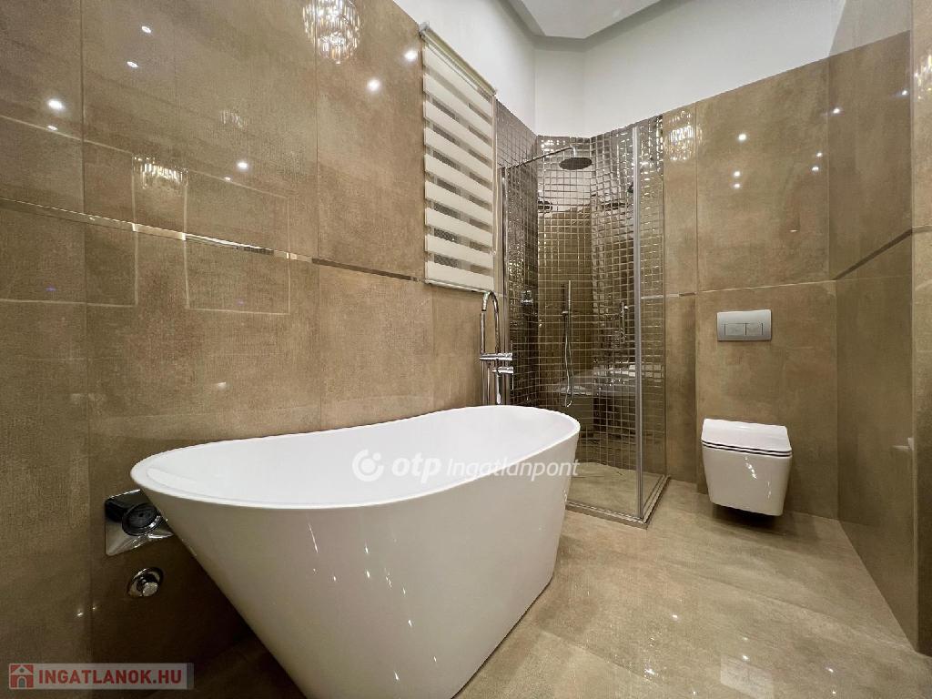 A fürdőben zuhanykabin és kád is el lett helyezve, okostükrök, márvány burkolat.